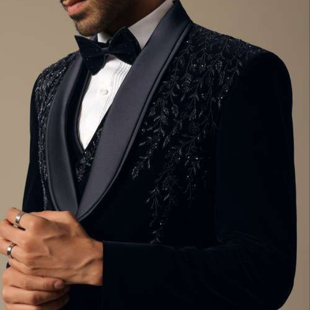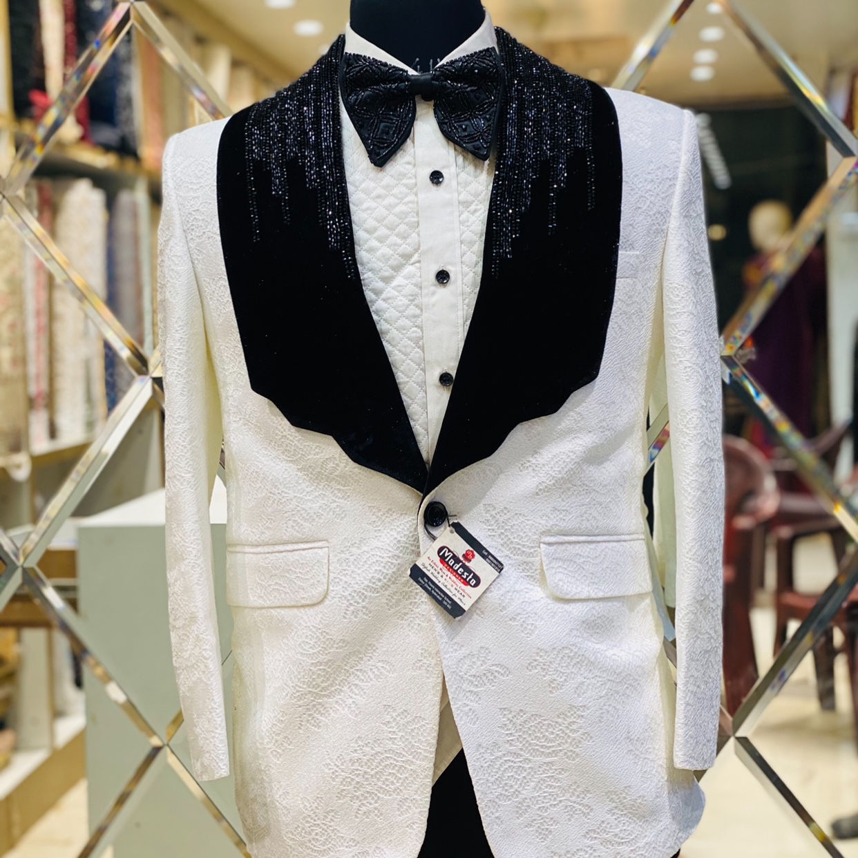 "Indulge in luxury with Modesto Designer's Cream Velvet Handcrafted Suit. Intricate handwork on the velvet lapel adds refinement, paired with a sophisticated bowtie for timeless elegance."